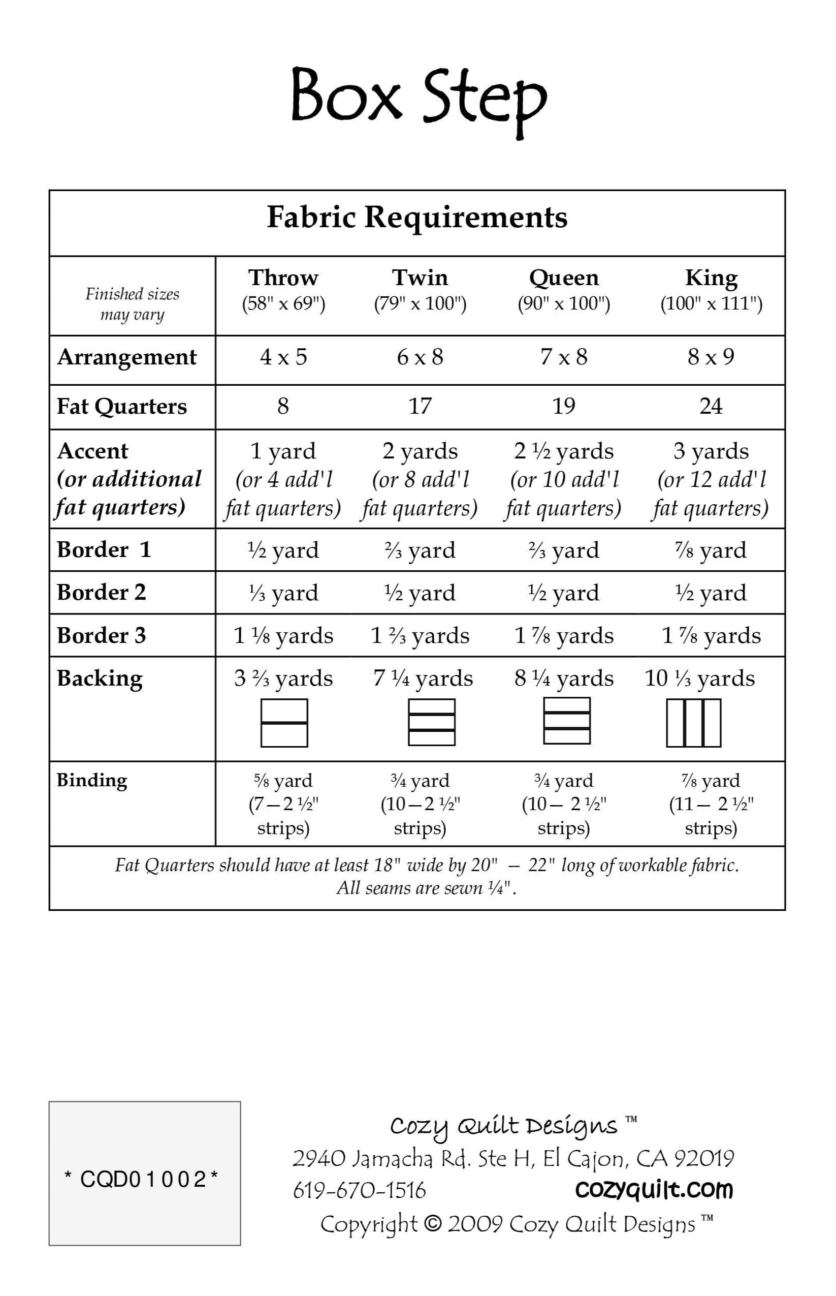 Boxes are hot! This pattern is perfect for any collection of fat quarters. One background fabric (yellow in our sample) makes the pattern come alive and the randomness of the squares add that contemporary touch.