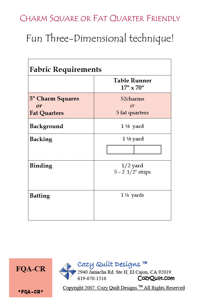 Try this fun three-dimensional technique to make a great table runner out of 5" charm squares or fat quarters! You can add machine embroidery to the background diamonds for a wonderful effect!