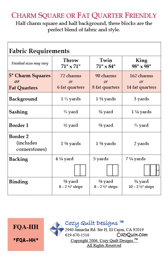 Half charm square and half background, these blocks are the perfect blend of fabric and style. In addition to your charm square or fat quarter fabric, you’ll pick two additional fabrics- background and sashing. Then add borders!