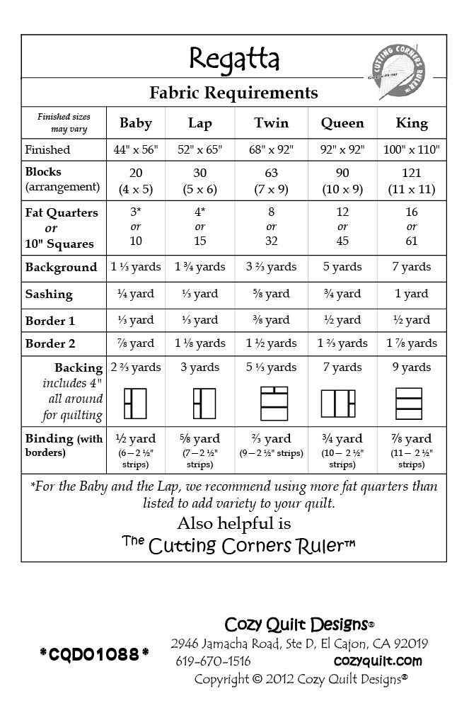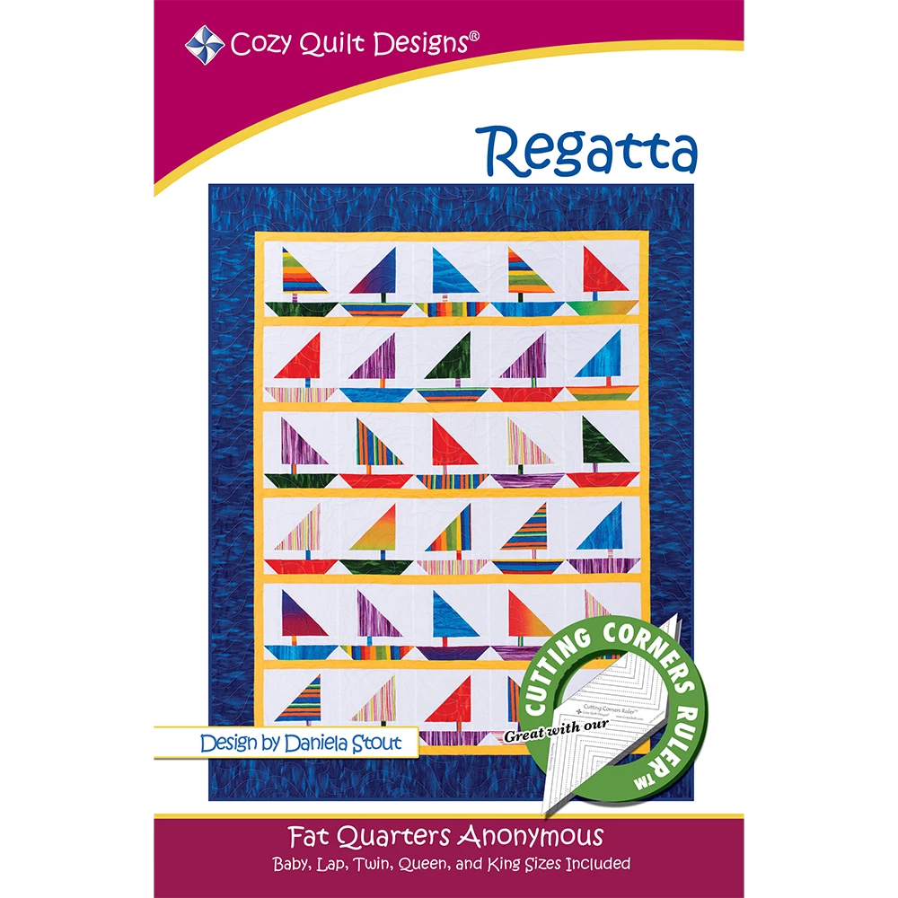 This fun-in-the-sun pattern is the perfect way to create your own sailboat regatta. Choose either fat quarters or 10" squares, use the slick Cutting Corners Technique, and these beauties will catch the wind (and your eye) in no time at all! Perfect for the beach house, the boat, or just a little summer fun. Keep it bright for kids or go with batiks for a more sophisticated yacht race. Fast, fun, and available in five sizes!