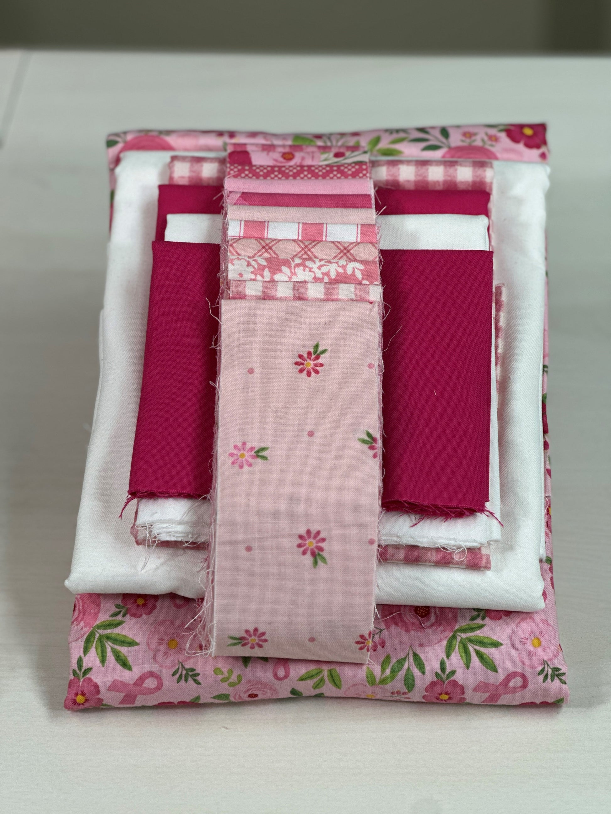 The Stepping Stones kit features Strength in Pink fabrics from Riley Blake honoring those affected by Breast Cancer.